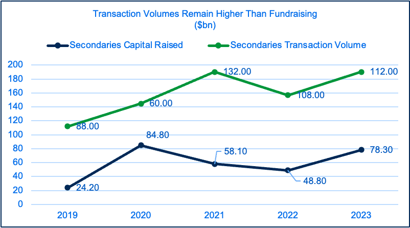 While fundraising has been successful, deal volumes have consistently exceeded fundraising, reaching $132 billion in 2021—and some forecasts are calling for this figure to exceed $140 billion by the end of 2024.4 In fact, with cumulative deal volume over the last five years reaching $500 billion and investor capital representing only $294 billion, a significant capital mismatch exists (Figure 1). This raises key questions for secondary players: